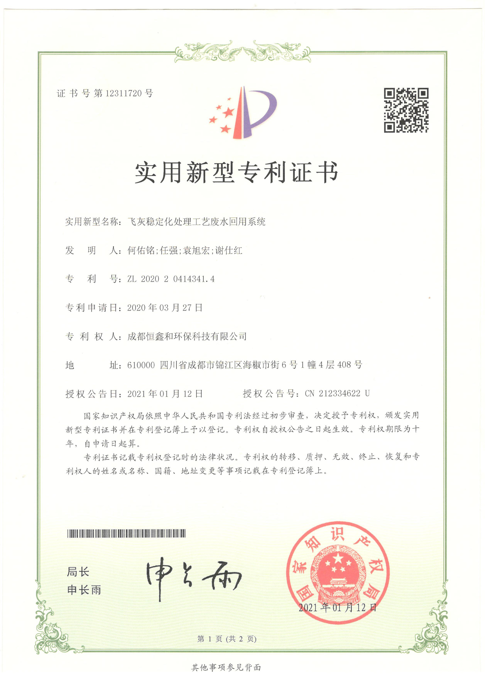 授權(quán)證書(分步式飛灰固化處理設(shè)備)